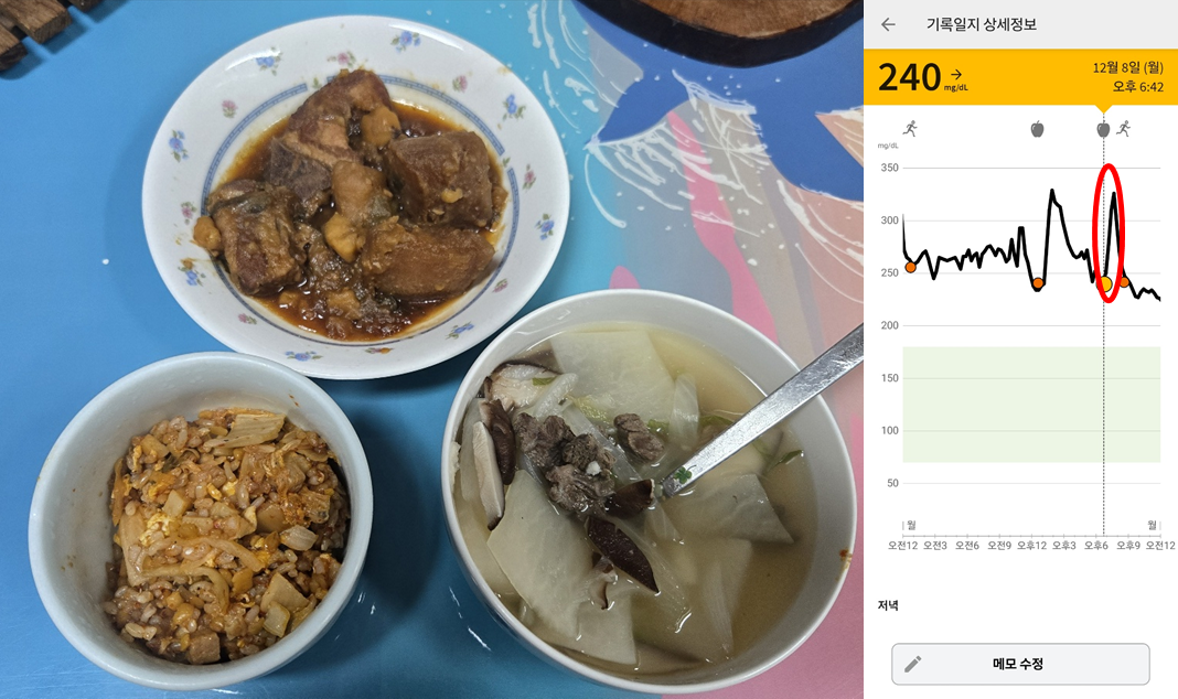 12월 8일 (저녁식사) : 김치볶음밥+돼지갈비찜+소고기무국 : 혈당 240 -> 330 (+90)