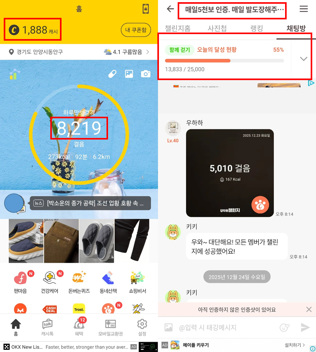 나는 무리하지 않기 위해 내가 최소한 할 수 있는 목표인 '5천 걸음'을 걷는 커뮤니티에 가입하였고 매일 인증을 하고 포인트를 획득하고 있다.