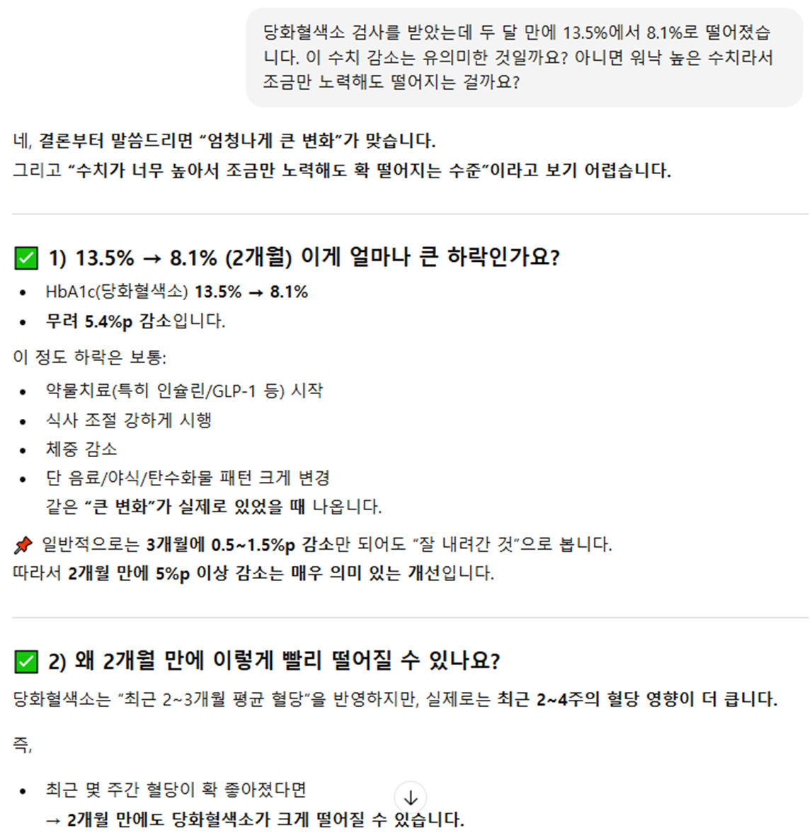 약 2달동안의 노력 결과 당화혈색소가 13.5%에서 8.1%로 떨어졌다.