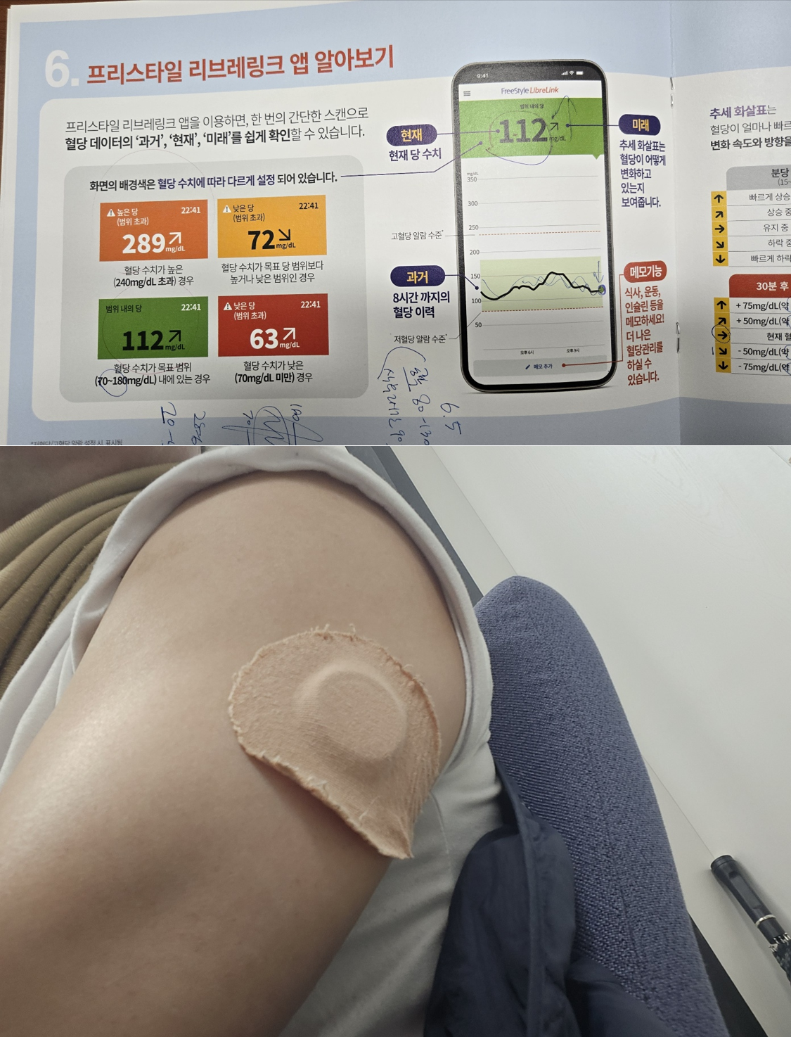 그리고 연속혈당체크기를 몸에 붙여줬는데 이게 좀 신기했다. 바늘을 팔뚝에 꽂고 센서와 핸드폰 어플리케이션이 통신을 하면서 내 혈당정보를 체크할 수 있었다. 근데 14일밖에 못 쓰고 거의 돈 10만원하기에 지속적으로 사용하기에는 조금 부담이 되긴 한다.