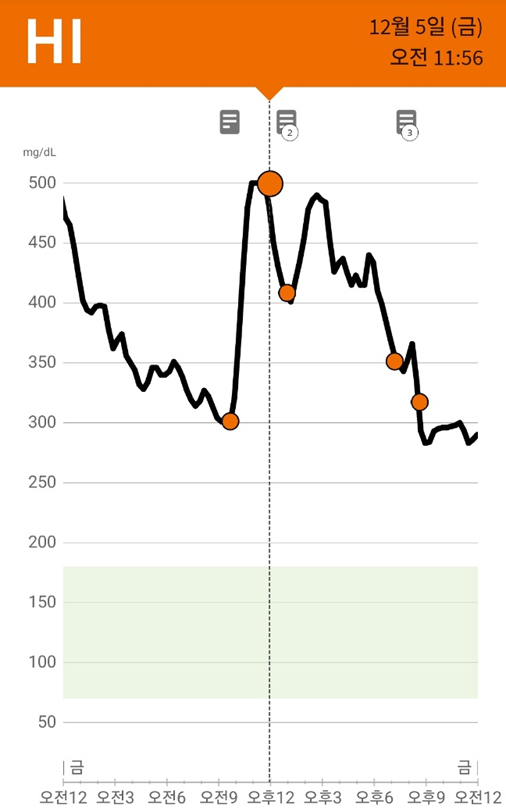 내 몸에 부착된 혈당측정기는 500이상은 측정이 불가... 그렇다면 저게 수치가 얼마나 올라갔는지는 미지수다...
